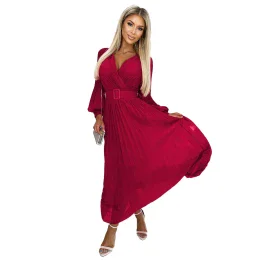 Dámské šaty 414-9 KLARA Numoco basic - bordó barva - řasené šaty z šifónu - překřížený dekolt - dlouhé rukávy