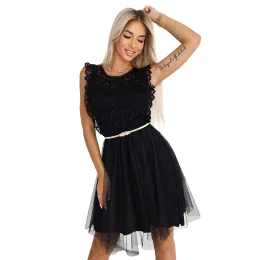 Dámské šaty 454-5 GRETA Numoco basic - černá barva - elegantní šaty - horní část zdobená krajkou - bez rukávů - zavazování na zlatý pásek - šifónová sukně