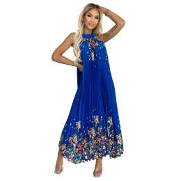 Dámské šaty 456-1 ESTER Numoco basic - královská modrá barva - řasené šaty ze saténu - symetrický květovaný vzor - bez rukávů