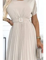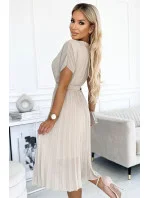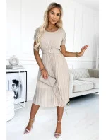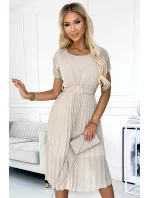 Dámské šaty 465-2 MIA Numoco basic - béžová barva - plisované šaty - kulatý výstřih - široký pásek - ze šifonu s podšívkou