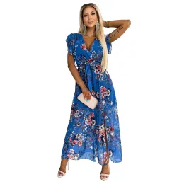 Dámské šaty 473-1 ARIA Numoco basic - modrá barva - se vzorem velkých květin - dlouhé šifónové šaty - psaníčkový výstřih - krátké rukávy - zavazování v pase na pásek