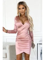 Dámské šaty 477-1 NUMOCO - starorůžová barva - psaníčkový výstřih - dlouhé rukávy - z mírně elastického saténu - zapínání vzadu na skrytý zip - ideálně zvýrazní postavu