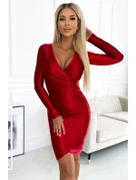 Dámské šaty 477-2 NUMOCO - červená barva - psaníčkový výstřih - dlouhé rukávy - z mírně elastického saténu - zapínání vzadu na skrytý zip - ideálně zvýrazní postavu