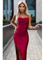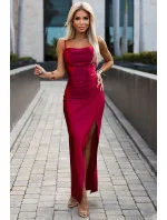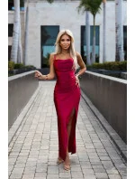 Dámské šaty 483-5 DIANE NUMOCO - malinová barva - dlouhé saténové šaty s rozparkem - překřížení na boku - ideální na tanec