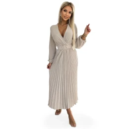 Dámské šaty 504-2 VIVIANA Numoco basic - béžová barva - z mačkavého materiálu - plisované midi šaty - dlouhé rukávy - psaníčkový výstřih - široký pásek