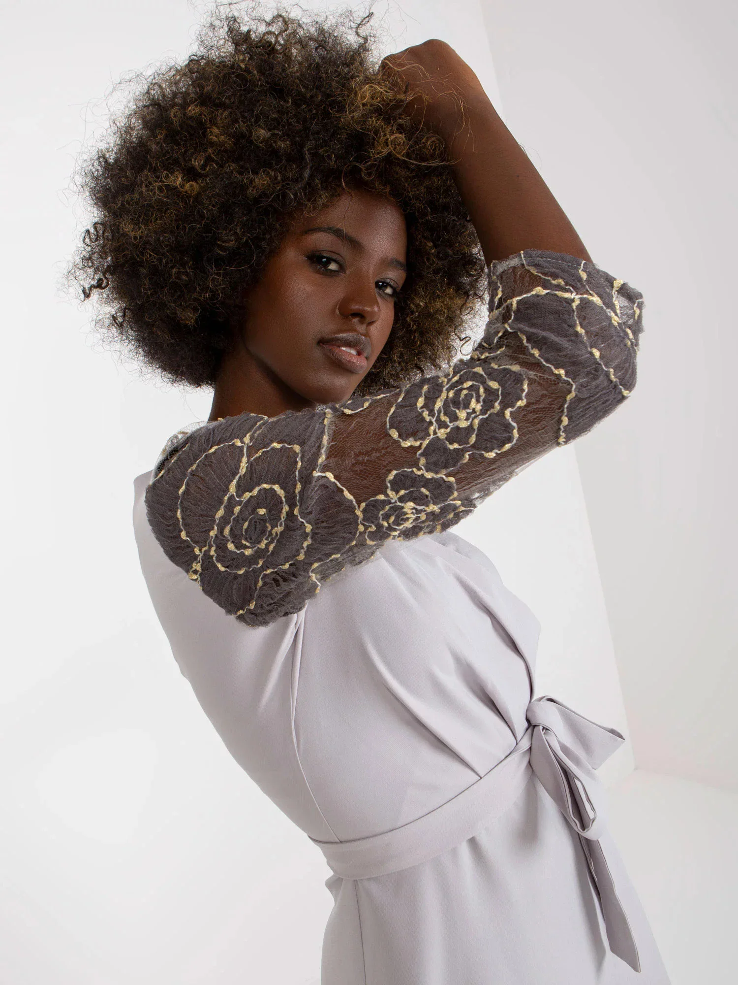 Dámské šaty s průhlednými krajkovými rukávy, zavazování v pase.