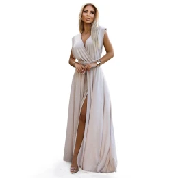 Dámské šaty 509-2 NUMOCO - béžová barva - z elastického materiálu - elegantní dlouhé maxi šaty - na ramínka - otevřený dekolt - překřížení na zádech - dlouhý rozparek