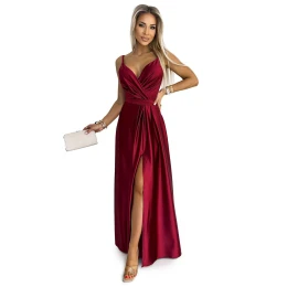 Dámské šaty 512-6 JULIET NUMOCO - bordó barva - z lesklého, hladkého a lehce elastického saténu - elegantní maxi dlouhé šaty - na ramínka - překřížený výstřih - dlouhý rozparek - zapínání vzadu na zip - ideální na svatby, plesy, silvestra a podobné události
