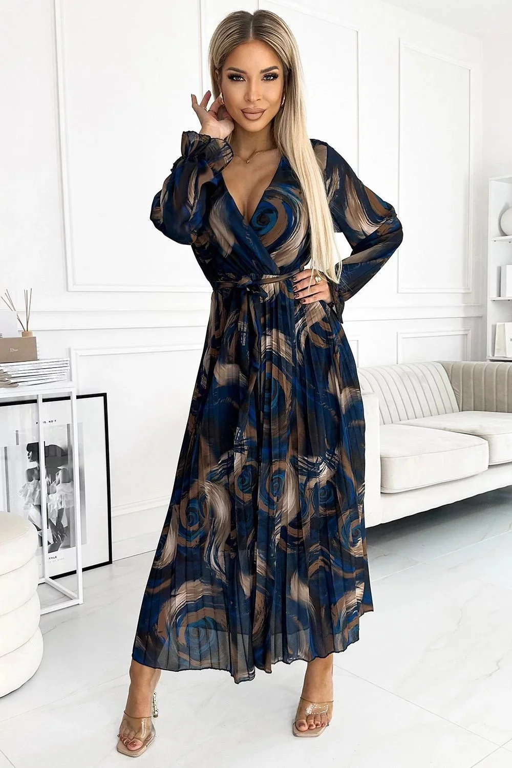 Dámské šaty 519-1 Numoco basic - modrá barva - ze šifónového materiálu s podšívkou - se vzorem béžových vln - dlouhé plisované šaty - psaníčkový výstřih - dlouhé rukávy - pásek na zavazování
