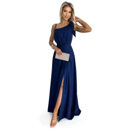 Dámské šaty 528-1 NUMOCO - tmavě modrá barva - z brokátové látky - dlouhé lesklé na jedno rameno - rozparek - zavazování v pase - vhodné na svatby, plesy, karnevaly