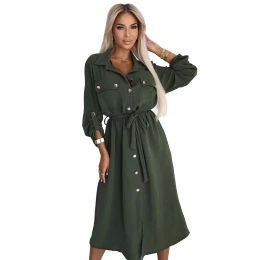Dámské šaty 531-5 Numoco basic - khaki barva - košilový typ - zapínání na zlaté knoflíky - vázání v pase - zdobená kapsami - s límečkem