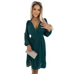 Dámské šaty 538-2 MILA NUMOCO - zelená barva - midi šaty - podšité podšívkou - dlouhé rukávy - psaníčkový výstřih - spodní díl zakončený volánem