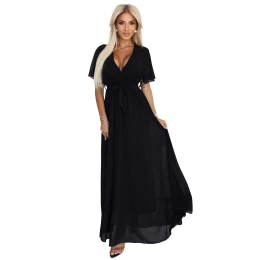 Dámské šaty 545-5 Numoco basic - černá barva - z šifónu - krátké volánkové rukávy - nabíraný výstřih - zavazování v pase
