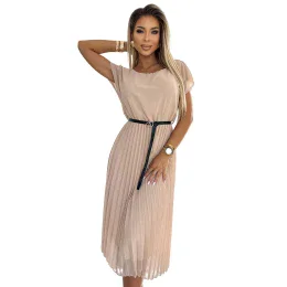 Dámské šaty 548-1 Numoco basic - béžová barva - z šifónového materiálu s podšívkou - plisované šaty - krátké rukávy - černý pásek