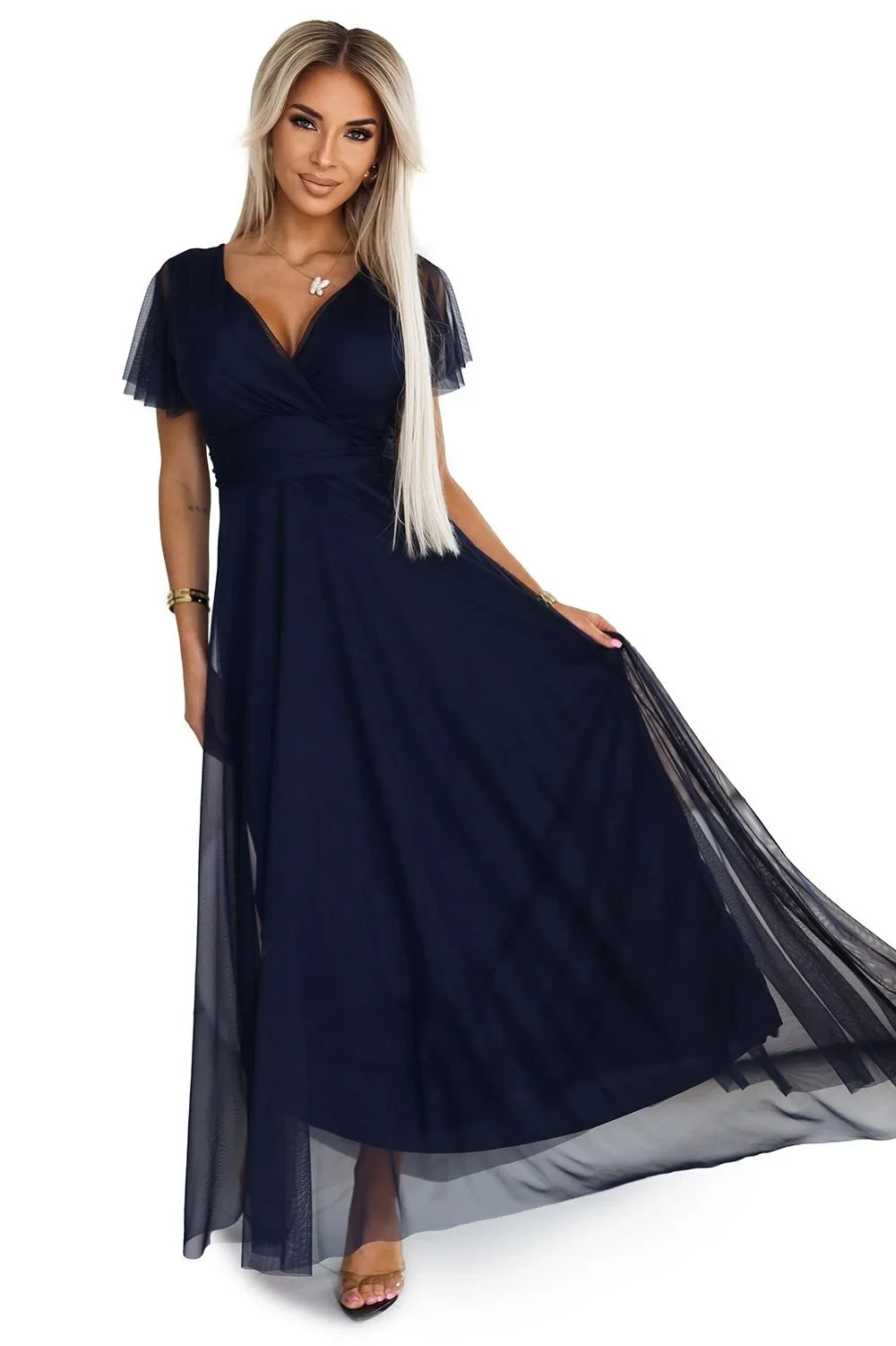 Dámské šaty 562-1 NASTIA Numoco basic - tmavě modrá barva - ze tmavě modrého tylu - vzdušné a lehké - srdíčkový výstřih - krátké rukávy - vyztužené košíčky - zavazování v pase