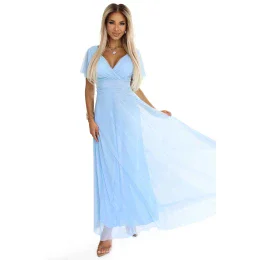 Dámské šaty 562-5 NASTIA Numoco basic - světle modrá barva - z tylu - vzdušné a lehké - srdíčkový výstřih - krátké rukávy - vyztužené košíčky - zavazování v pase