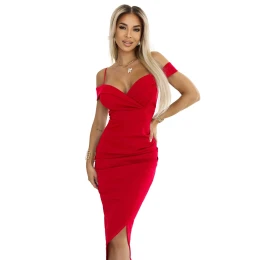 Dámské šaty 564-10 CALLIE Numoco basic - červená barva - odhalená ramena a výstřih - vycpávky na prsou - na zádech zapínání na zip - stylové řasení na břiše - ideální na večerní vycházky a zvláštní příležitosti