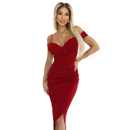 Dámské šaty 564-8 CALLIE Numoco basic - bordó barva - odhalená ramena a výstřih - vycpávky na prsou - na zádech zapínání na zip - stylové řasení na břiše - ideální na večerní vycházky a zvláštní příležitosti