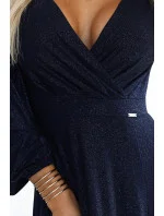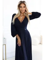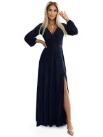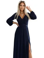 Dámské šaty 572-1 NELA NUMOCO - tmavě modrá barva - z lesklého elastického materiálu - volné dlouhé rukávy - výstřih do "V" - v zadní části smyslný výstřih - elegantní dlouhé šaty