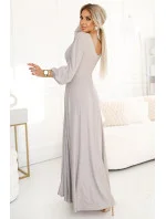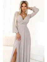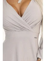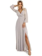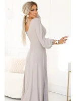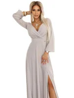 Dámské šaty 572-3 NELA NUMOCO - béžová barva - z lesklého elastického materiálu - volné dlouhé rukávy - výstřih do "V" - v zadní části smyslný výstřih - elegantní dlouhé šaty
