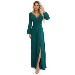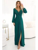 Dámské šaty 572-4 NELA NUMOCO - zelená barva - z lesklého elastického materiálu - volné dlouhé rukávy - výstřih do "V" - v zadní části smyslný výstřih - elegantní dlouhé šaty