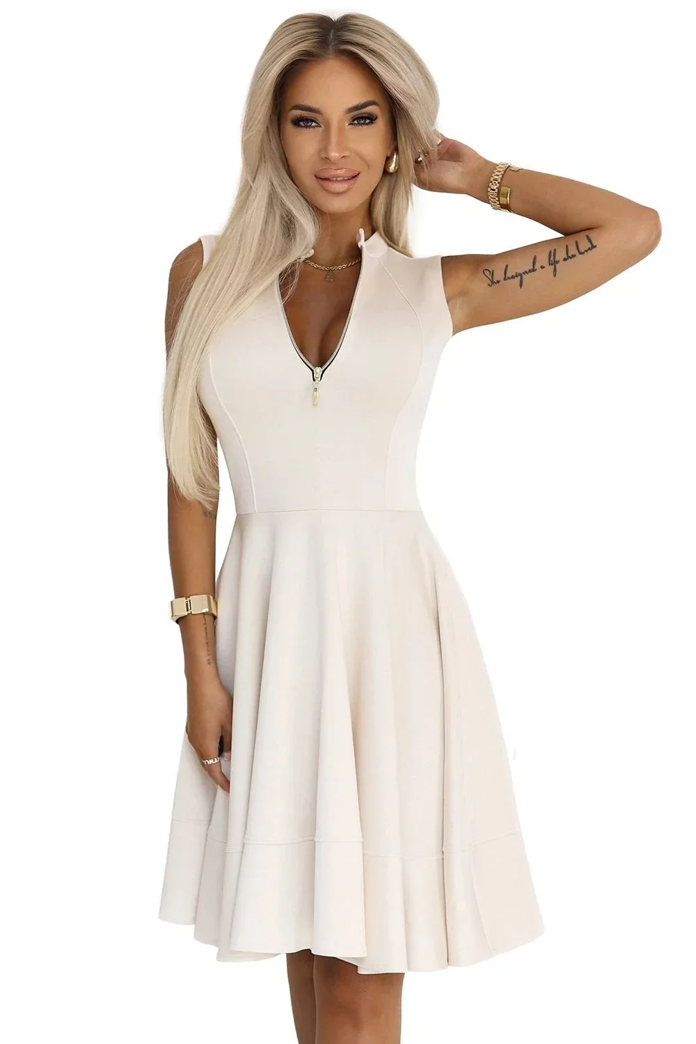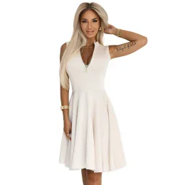 Dámské šaty 573-3 NUMOCO - béžová barva - z elastické silnější tkaniny - výstřih se zipem - sukně zakončená volánkem - perfektně sedí