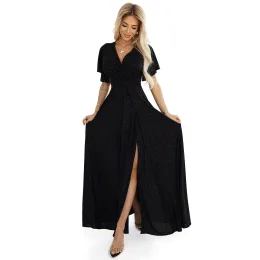 Dámské šaty 581-1 JENNIFER NUMOCO - černá barva - z lesklého brokátu - krátké rukávy - psaníčkový výstřih - dlouhý rozparek - vypasovaný střih s páskem