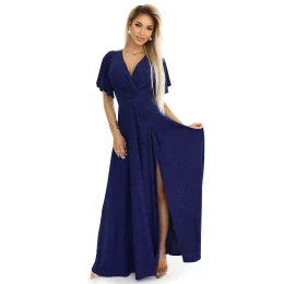 Dámské šaty 581-5 JENNIFER NUMOCO - tmavě modrá barva - z lesklého brokátu - krátké rukávy - psaníčkový výstřih - dlouhý rozparek - vypasovaný střih s páskem