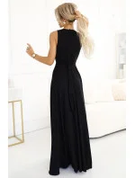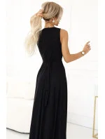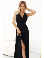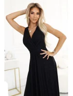 Dámské šaty 587-1 MONIQUE NUMOCO - černá barva - z lesklého brokátového materiálu - psaníčkový výstřih - široká ramínka - vysoký rozparek - pásek v pase tvaruje postavu