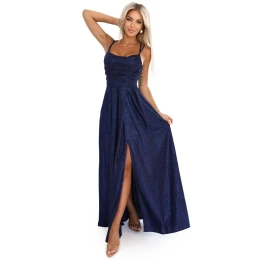 Dámské šaty 589-2 NUMOCO - tmavě modrá barva - z lesklého třpytivého materiálu - vodopádový výstřih - tenká ramínka - korzetové šněrování na zadní straně - smyslný rozparek na noze - ideální na plesy, svatby nebo večírky