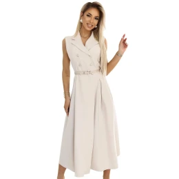 Dámské šaty 596-1 Numoco basic - béžová barva - košilový typ - s límečkem - bez rukávů - zapínání na knoflíky - vázání v pase opaskem - rozšířená spodní část