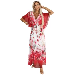 Dámské šaty 603-1 Numoco basic - červená barva - s květinový vzorem - z jemného šifónu na podšívce - zavinovací výstřih - krátké rukávy typu motýl - ozdobné zavazování vzadu na zádech - rozšířený střih - gumička v pase se přizpůsobuje postavě a zdůrazňuje pas