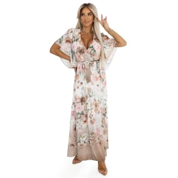 Dámské šaty 603-2 Numoco basic - béžová barva - s květinový vzorem - z jemného šifónu na podšívce - zavinovací výstřih - krátké rukávy typu motýl - ozdobné zavazování vzadu na zádech - rozšířený střih - gumička v pase se přizpůsobuje postavě a zdůrazňuje pas
