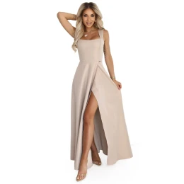 Dámské šaty 633-1 AURELIA NUMOCO - béžová barva - s jemným brokátovým leskem - čtvercový výstřih jemně podtrhuje krk a ramena - na široká ramínka - smyslný rozparek na noze - ideální na svatbu, ples, silvestr nebo rodinné oslavy