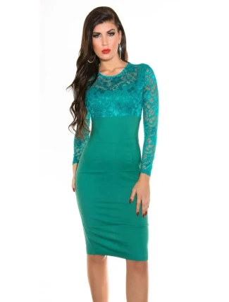 Krásné večerní šaty s dlouhými rukávy a kulatým výstřihem. Horní polovinu šatů překrývá krajka. Boční zipové zapínání.