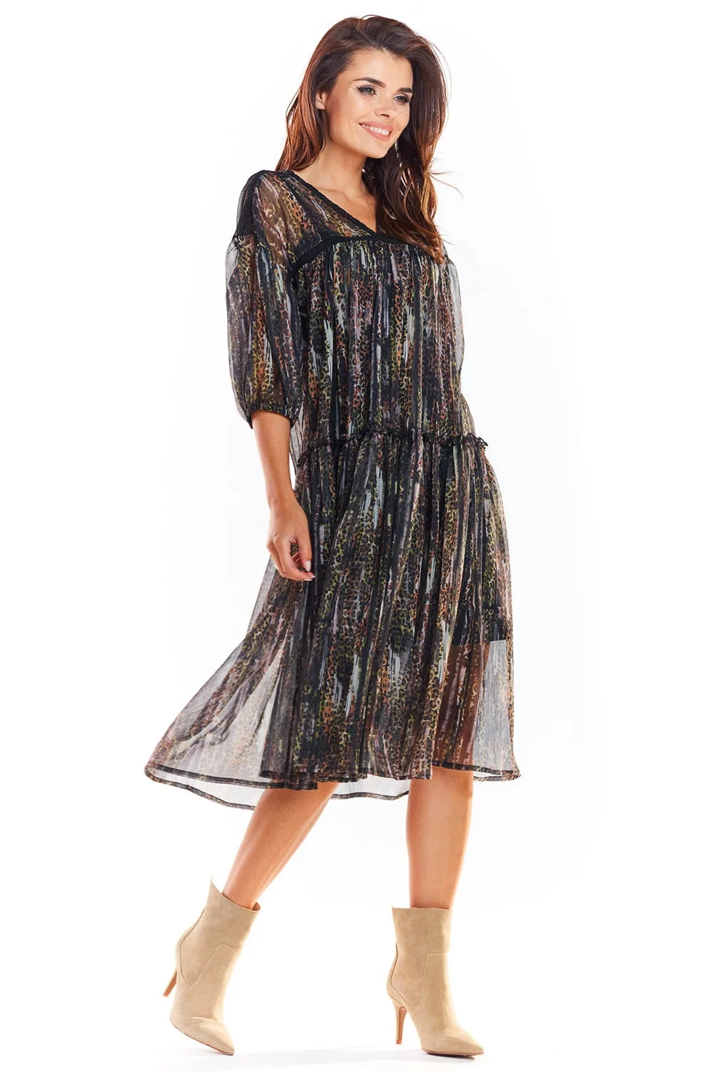 Dámské šifonové šaty s moderním potiskem a dlouhými rukávy. Šaty jsou v délce midi, mají volný střih. Zadní část je vyrobena z černého tylu a přední část má ozdobné krajkové vložky.