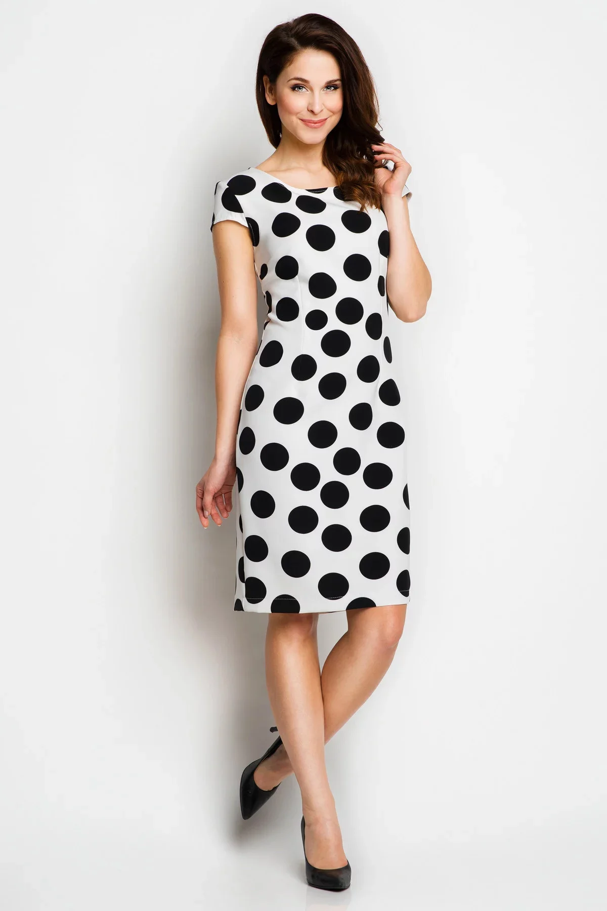 Čarovný šaty s krátkými rukávy. Tužka šaty je řez. Šaty vyrobené z materiálu v puntíkované připevněnou na zip.