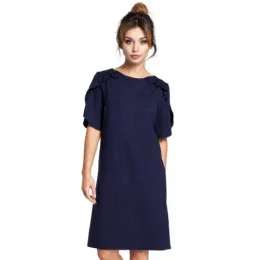 Dámske šaty s krátkymi rukávmi s volánikovým lemom, okrúhlym výstrihom a zapínaním na gombík na zadnej strane.