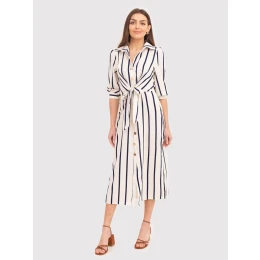 Krémové a tmavě modré pruhované midi šaty s 3/4 rukávy a knoflíky.