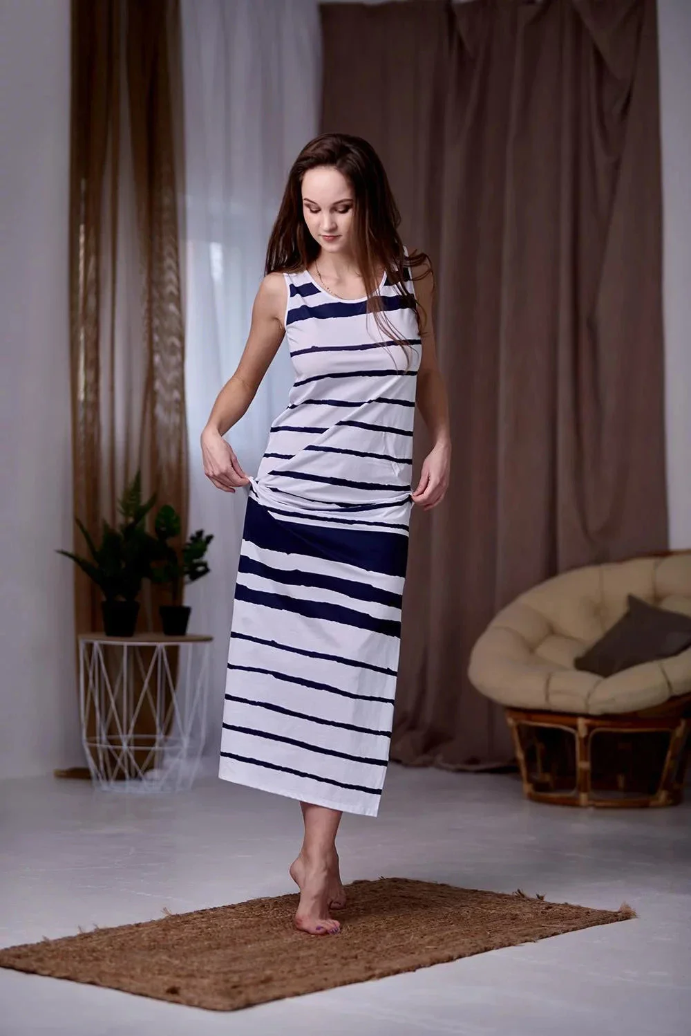 Hladké a volné letní šaty s hlubokým rozparkem. Zvýrazňují je stylové černé a bílé pruhy střídavé velikosti.