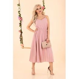 Krásné, pastelové, vzdušné šaty, délka midi, délka do půli lýtek, ve spodní části zakončené lehkým, módním řasením. Střih je uprostřed v pase projmutý, což umožňuje žensky zvýraznit horní část těla. Spodní část je vzdušná a volná, výstřih do V, ramínka v podobě tenkých šňůrek, složení: 95 % polyester, 5 % spandex. Model měří 170 cm.