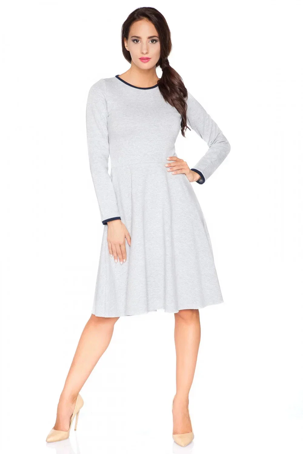 Šaty z pletené mikiny, v pase přestřižené. Výstřih a rukávy zakončené lemováním v kontrastní barvě. Spodní část šatů je rozšířená a ponechaná v surovém stavu.