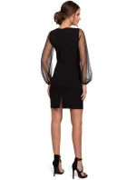 Jednoduchý střih mini šatů byl zpestřen bufetovými rukávy z průhledné síťoviny v malých hrášcích, které dodávají šatům jedinečnou lehkost. Ženské a s charakterem