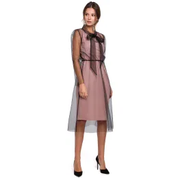 Tyto šaty jsou rozhodně jedinečné. Díky dvěma vrstvám: uvnitř jsou měkké, hedvábné mini šaty bez rukávů s výstřihem do V a vně průsvitná tylová vrstva s dlouhými rukávy a zavazováním si zaslouží pozornost.