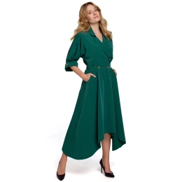 Tyto krásné klasické šaty mají uvolněný horní díl s límcem a širšími ohrnutými rukávy. Rozměrná sukně má asymetrický lem a ozdobné knoflíky v pase. Jsou to elegantní šaty do města, které se hodí do práce i na večerní procházku.