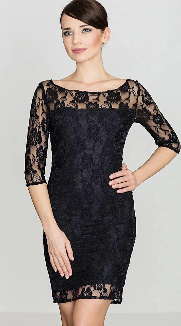 Nevšední romanticky působící šaty z příjemného materiálu s květinovým vzorem K109 KATRUS mají rukáv těsně pod loket a délku nad kolena.