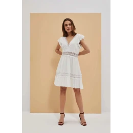 Bílé šaty. Hladký materiál, žádné vzory. Krátké volánové rukávy. Výstřih do V, zdobený krajkou. Z viskózy, lehkého materiálu zdobené krajkou. Zapínání na zip pro snadné nazouvání. Navíc má podšívku. Rozšířený střih, směrem dolů se mírně rozšiřující. Délka nad kolena. Ideální volba pro zvláštní příležitosti a významné události.
