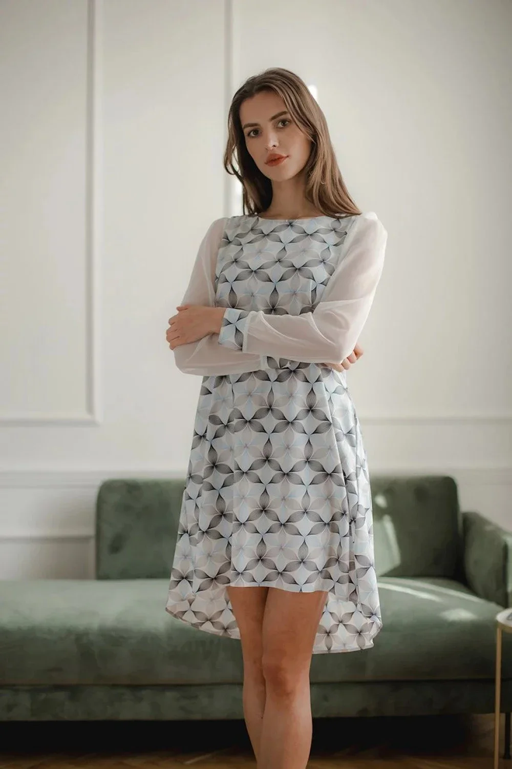 Elegantní vzorované midi šaty s dlouhými síťovanými rukávy s manžetou. Šaty mají rozšířený spodní lem. Vzadu jsou delší a v pase mají ozdobné záhyby. Boční kapsy ve švech, bez zapínání.