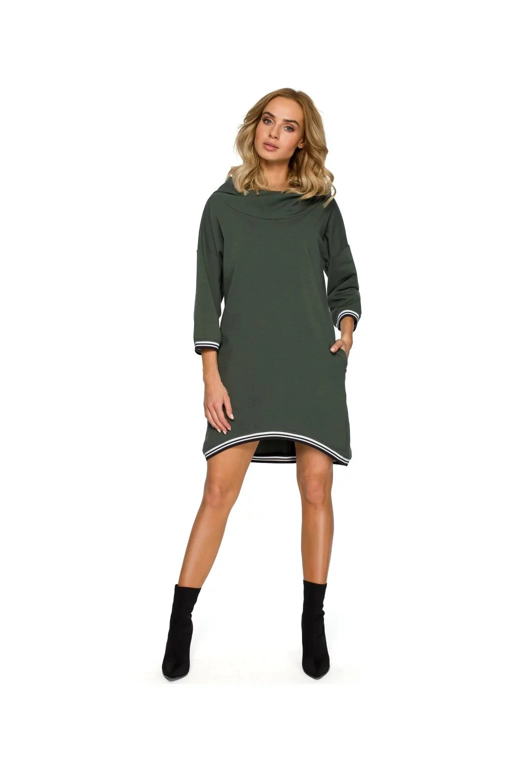Univerzální a praktická tunika, mikina nebo mini šaty s žebrovaným lemem ve stejné barvě, velkou kapucí a kapsami.