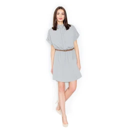 Lehounké košilové minišaty širšího střihu, u krku límeček se zapínáním na patent, krátké rukávy, sukně vpředu i vzadu dokulata, v pase tenký pásek.